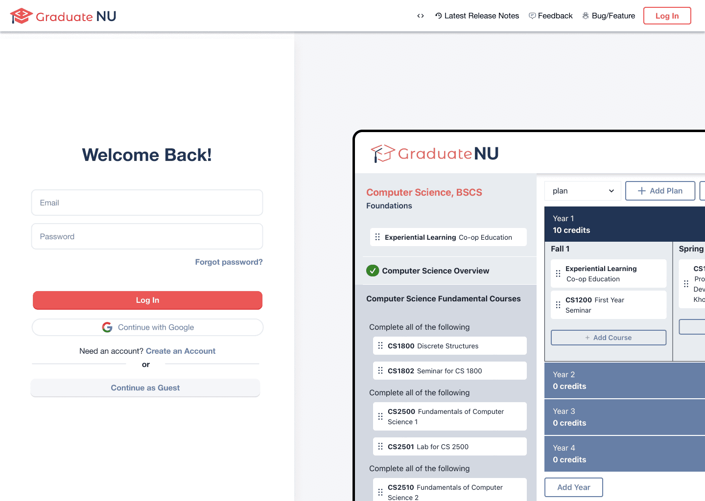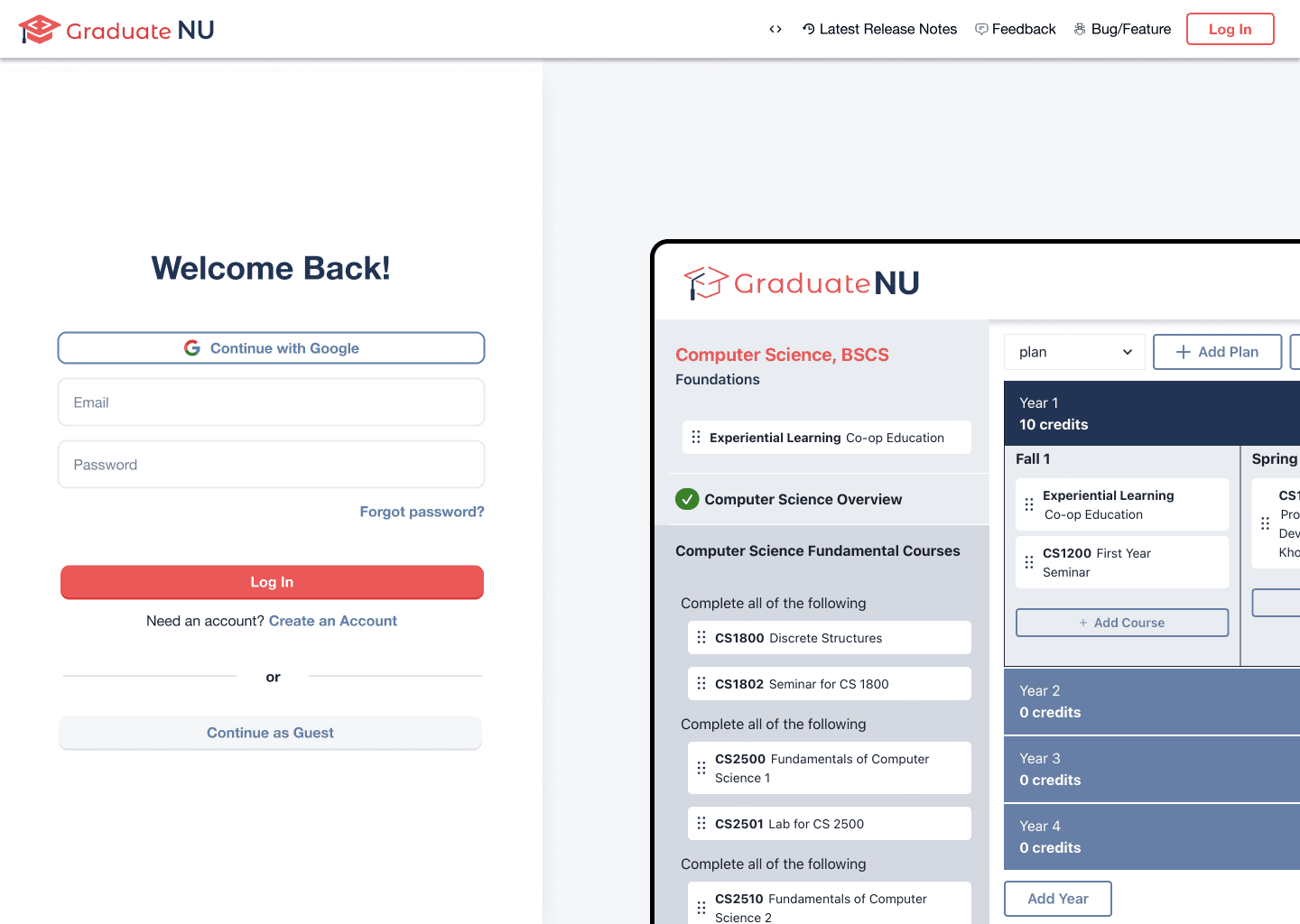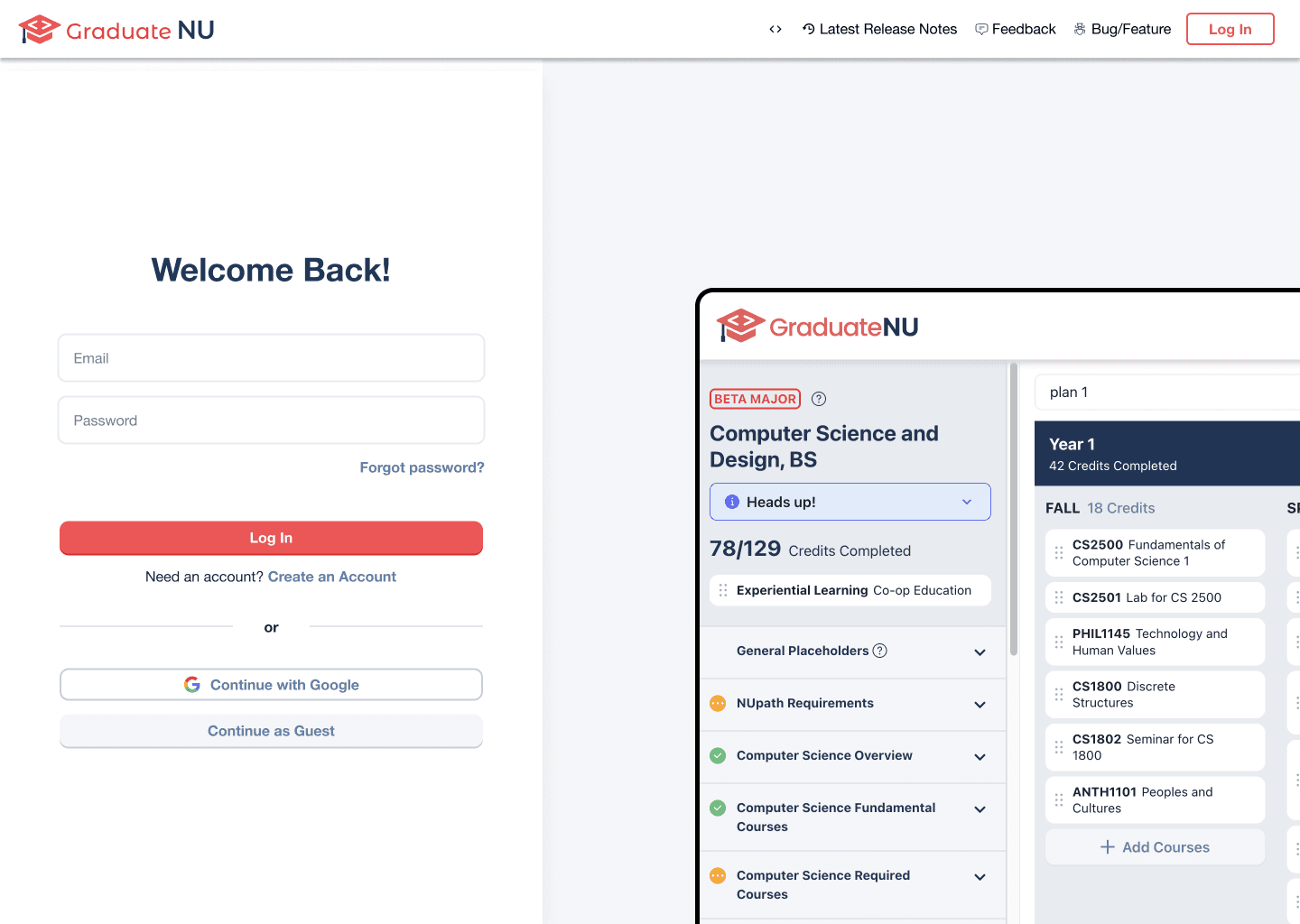 GraduateNU is an degree planning tool created by Northeastern (NEU) students, for Northeastern students. Our goal is to help students plan better and navigate NEU graduation requirements to create a personalized plan of study.
